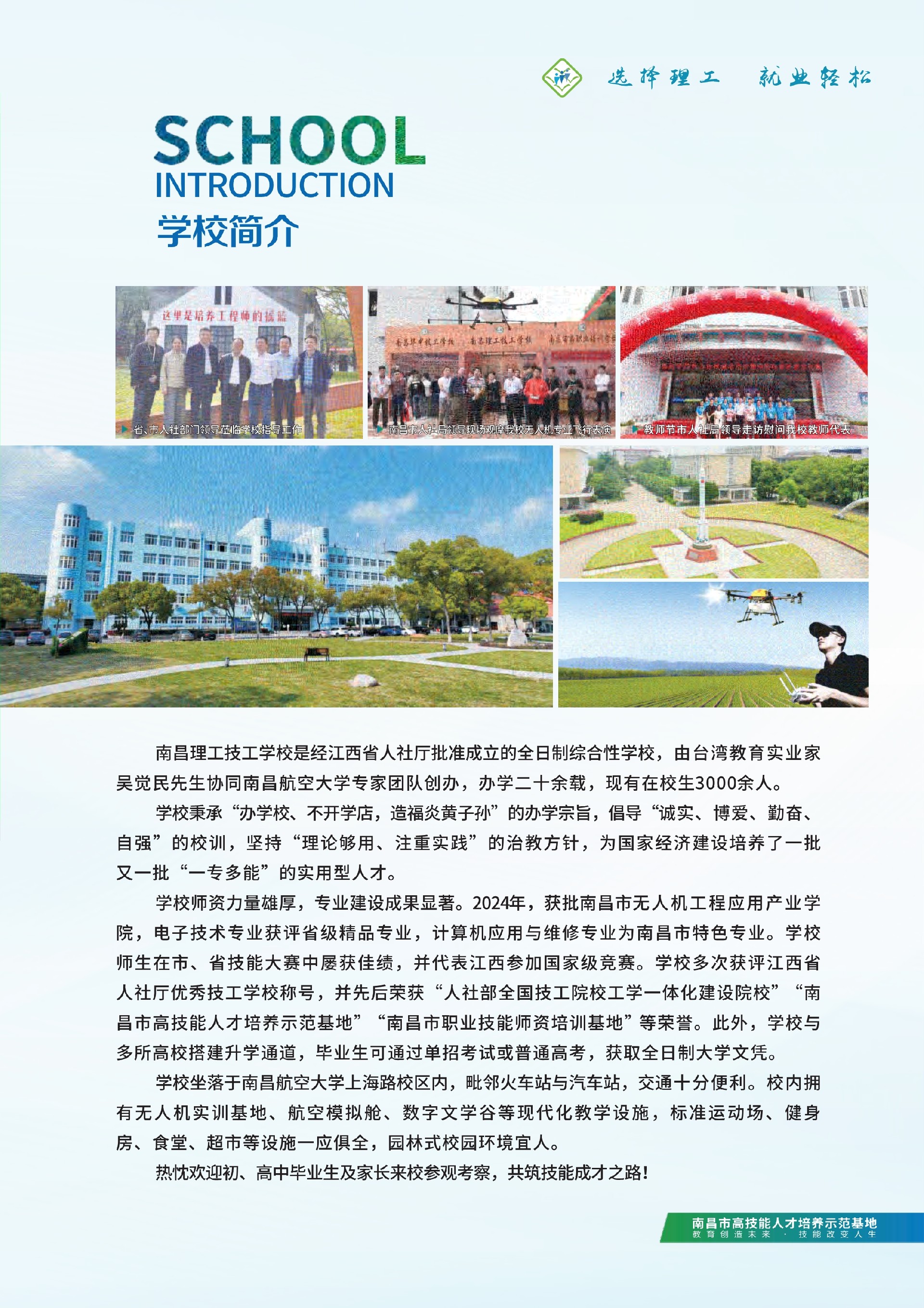 南昌理工技工学校是经江西省人社厅批准成立的全日制综合性学校,由台湾教育实业家吴觉民先生协同南昌航空大学专家团队创办,办学二十余载,现有在校生3000余人。学校秉承“办学校、不开学店,造福炎黄子孙”的办学宗旨,倡导“诚实、博爱、勤奋、自强”的校训,坚持“理论够用、注重实践”的治教方针,为国家经济建设培养了一批又一批“一专多能”的实用型人才。