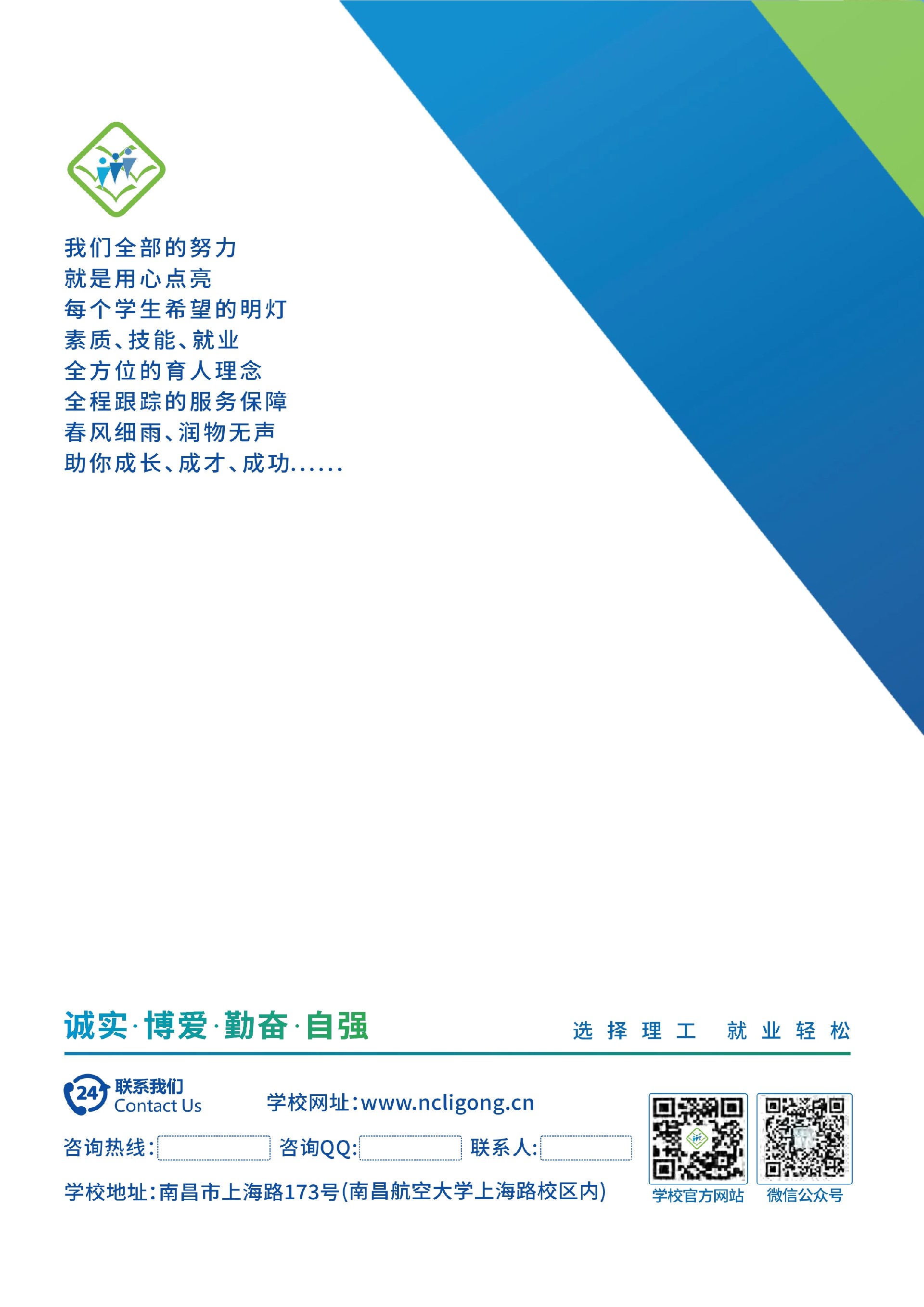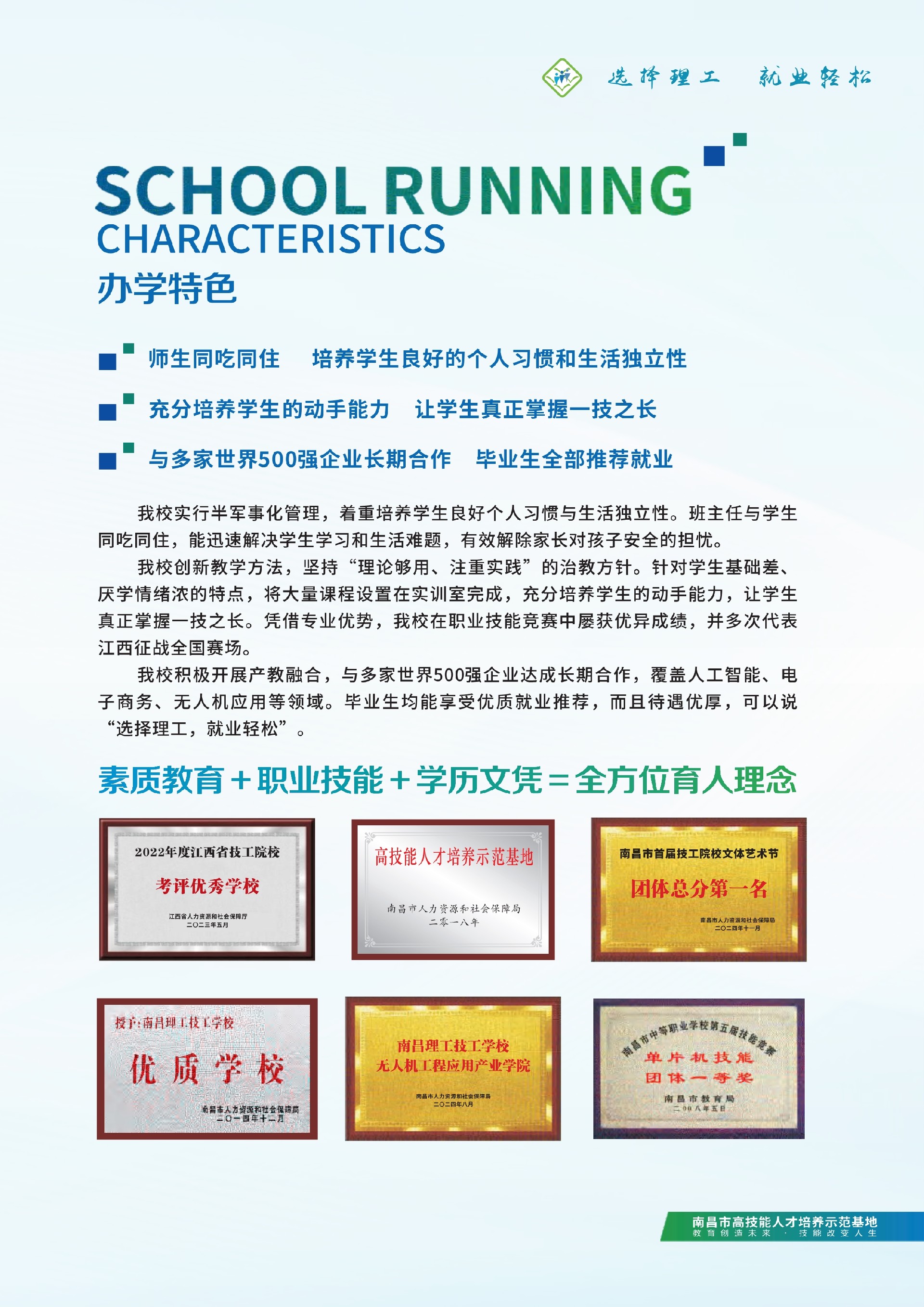 南昌理工技工学校是经江西省人社厅批准成立的全日制综合性学校,由台湾教育实业家吴觉民先生协同南昌航空大学专家团队创办,办学二十余载,现有在校生3000余人。学校秉承“办学校、不开学店,造福炎黄子孙”的办学宗旨,倡导“诚实、博爱、勤奋、自强”的校训,坚持“理论够用、注重实践”的治教方针,为国家经济建设培养了一批又一批“一专多能”的实用型人才。